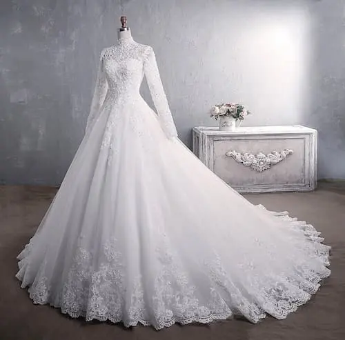 Vestido de Noiva Princesa Evasê com manga longa, gola alta e renda francesa perolada.